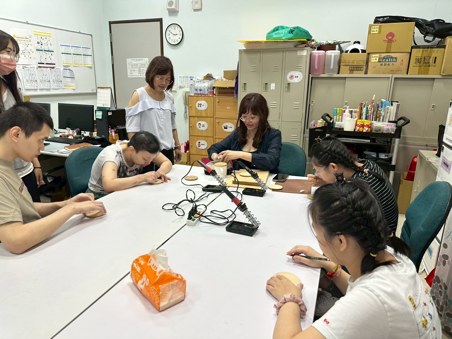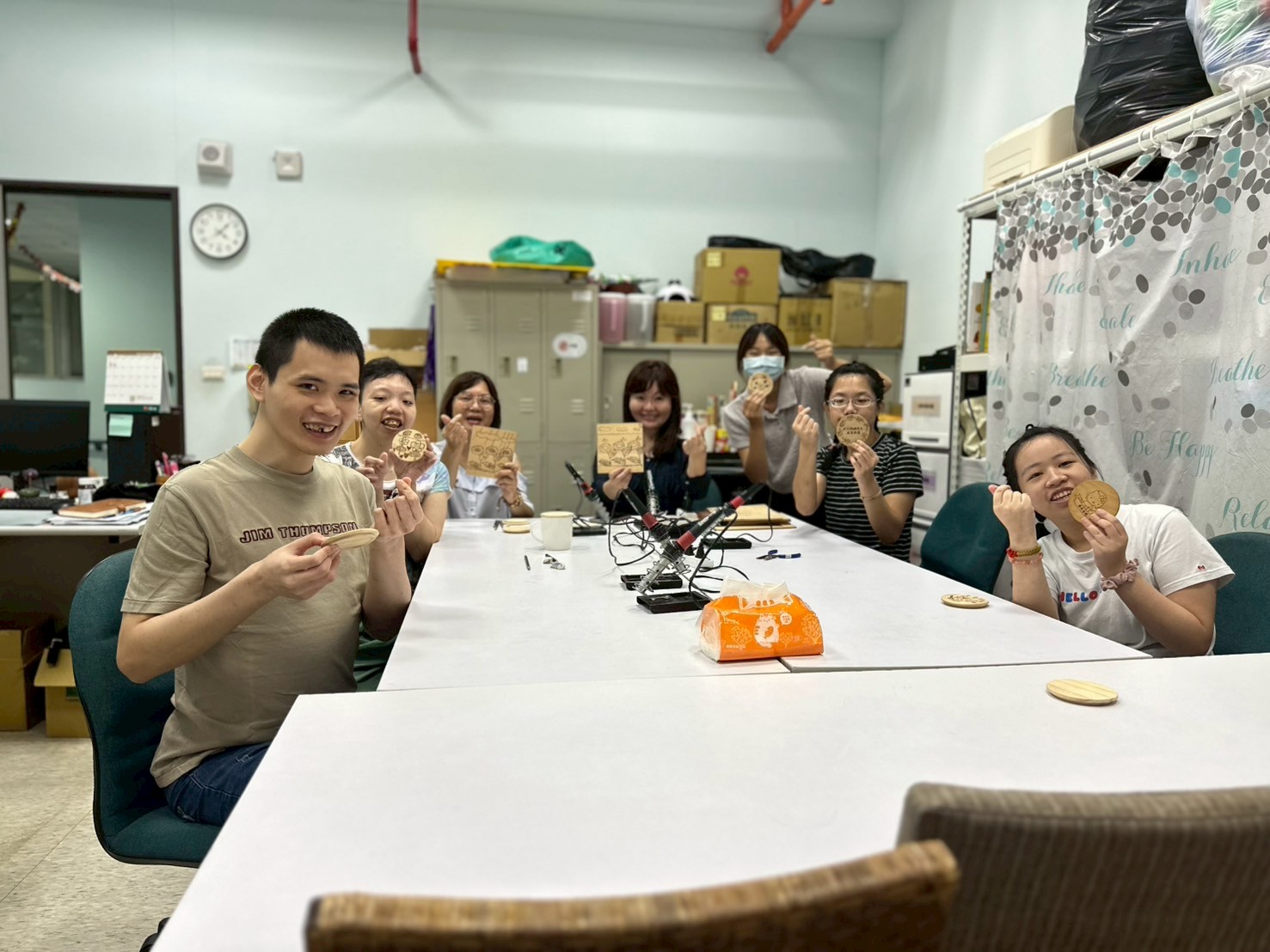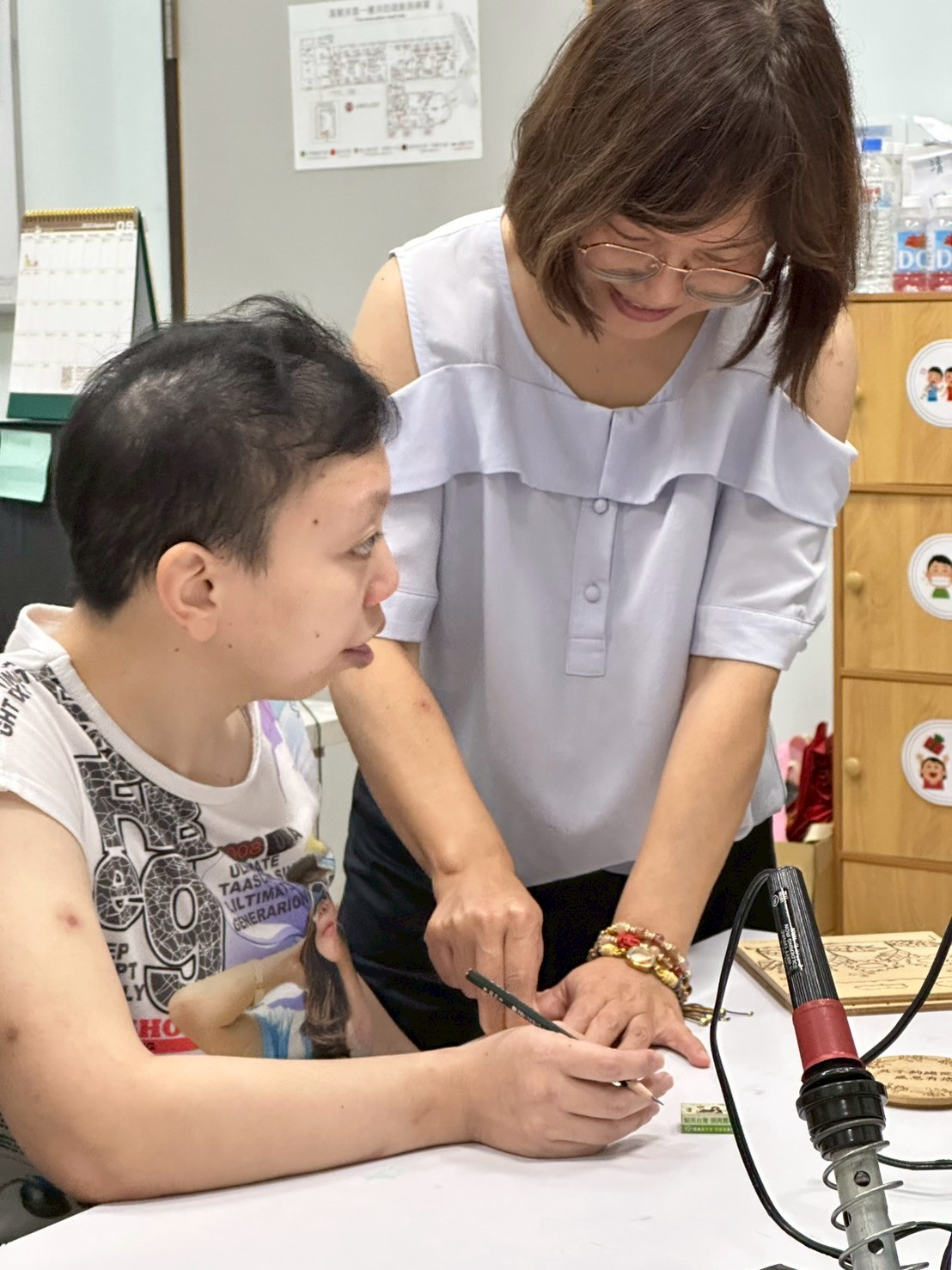 今日護理督導來帶我們烙畫班,也一步一步手把手的帶著我們,從開始加熱器具到直接烙在作品上,這對服務對象來說真的蠻困難的,而且較抽象,需要非常有耐心的教導他們,整個過程大約持續一小時,最後完成時,看到大家拿著自己作品與老師分享,真的非常有成就感,期待下次烙畫班~