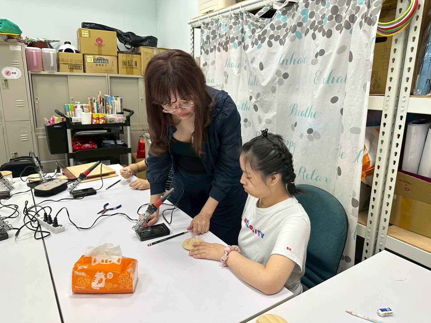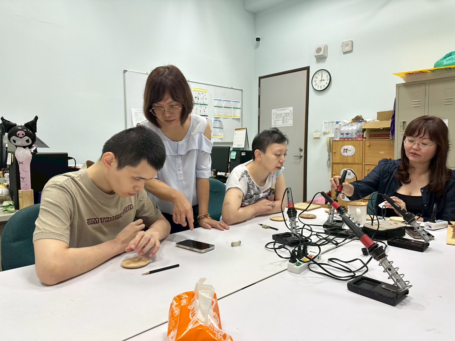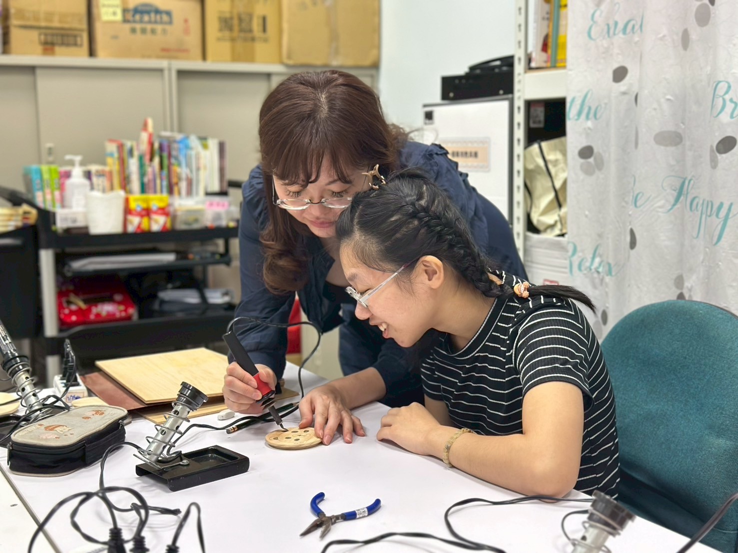 今日護理督導來帶我們烙畫班,也一步一步手把手的帶著我們,從開始加熱器具到直接烙在作品上,這對服務對象來說真的蠻困難的,而且較抽象,需要非常有耐心的教導他們,整個過程大約持續一小時,最後完成時,看到大家拿著自己作品與老師分享,真的非常有成就感,期待下次烙畫班~