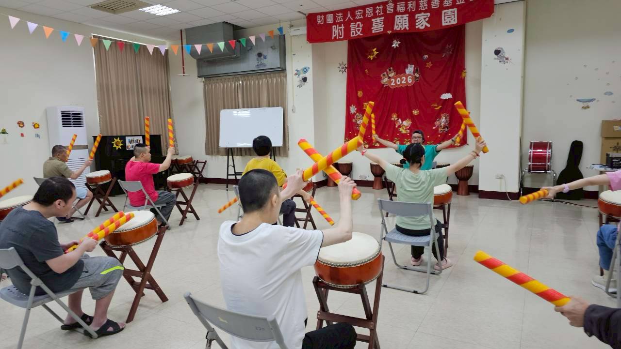從這個月開始,每週四下午是我們最熱鬧的時刻。我們特別邀請到了專業的 張軒鴻老師 親自來到家園帶領服務對象。課程中,老師不僅教授打鼓技巧,更在練習前設計了專業的熱身律動,讓大家在敲響鼓聲前,身體先暖起來、動起來!