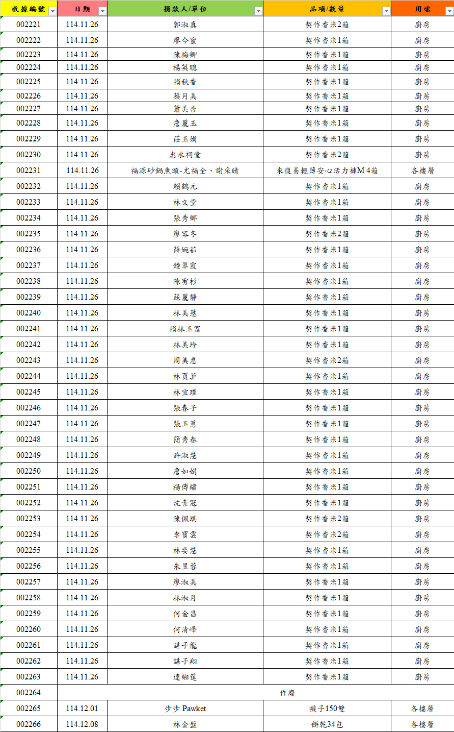 114年12月喜願家園捐物公開徵信 備註:親愛的捐款人, 依財團法人法第25條規定,除捐贈者事先表示反對外,本家園需主動公開捐贈者姓名及金額,如不同意公開,請於捐款時主動說明「不同意捐款姓名公開揭露」,並填寫【捐款資料聲明書】,以利後續作業進行。選擇不公開之捐款人,本家園將以「善心人士」方式揭露。