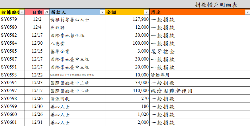 114年12月喜願家園捐款公開徵信 備註:親愛的捐款人, 依財團法人法第25條規定,除捐贈者事先表示反對外,本家園需主動公開捐贈者姓名及金額,如不同意公開,請於捐款時主動說明「不同意捐款姓名公開揭露」,並填寫【捐款資料聲明書】,以利後續作業進行。選擇不公開之捐款人,本家園將以「善心人士」方式揭露。
