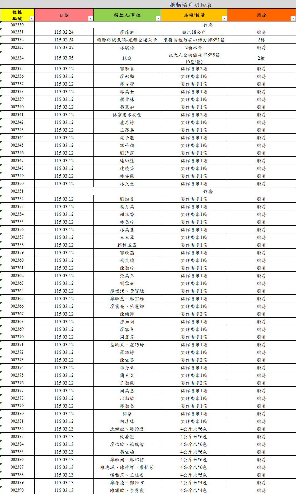 115年3月喜願家園捐物公開徵信 備註:親愛的捐款人, 依財團法人法第25條規定,除捐贈者事先表示反對外,本家園需主動公開捐贈者姓名及金額,如不同意公開,請於捐款時主動說明「不同意捐款姓名公開揭露」,並填寫【捐款資料聲明書】,以利後續作業進行。選擇不公開之捐款人,本家園將以「善心人士」方式揭露。